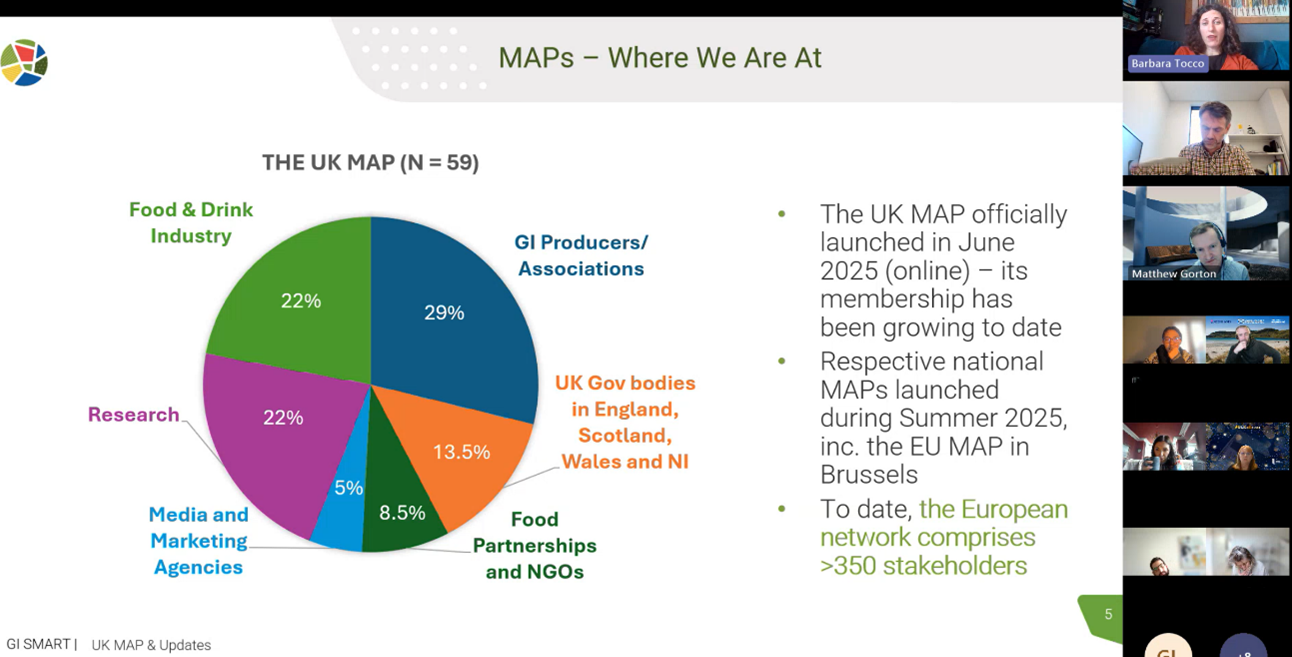 The second UK Multi-Actor Platform (MAP) meeting took place online on 10 December, bringing together 19 stakeholders from across the food and drink sector, government, research institutions and civil society. The meeting aimed to share latest consumer research findings from the GI SMART project and discuss opportunities and benefits for the UK MAP to get involved.